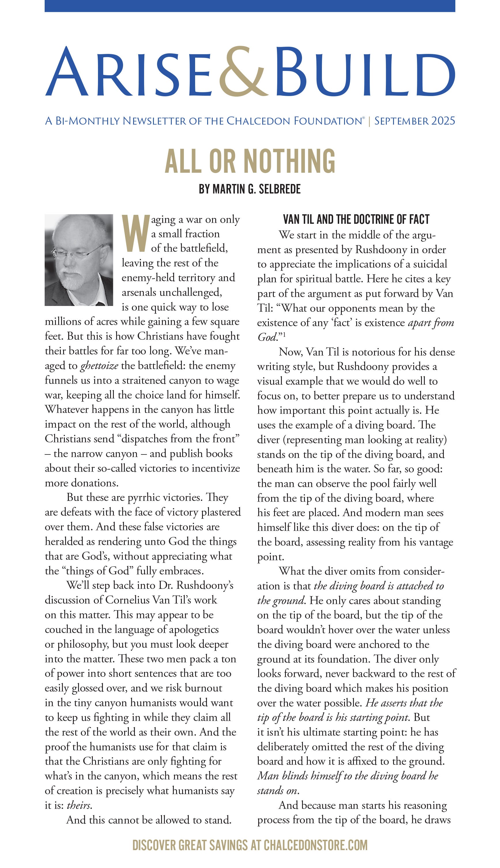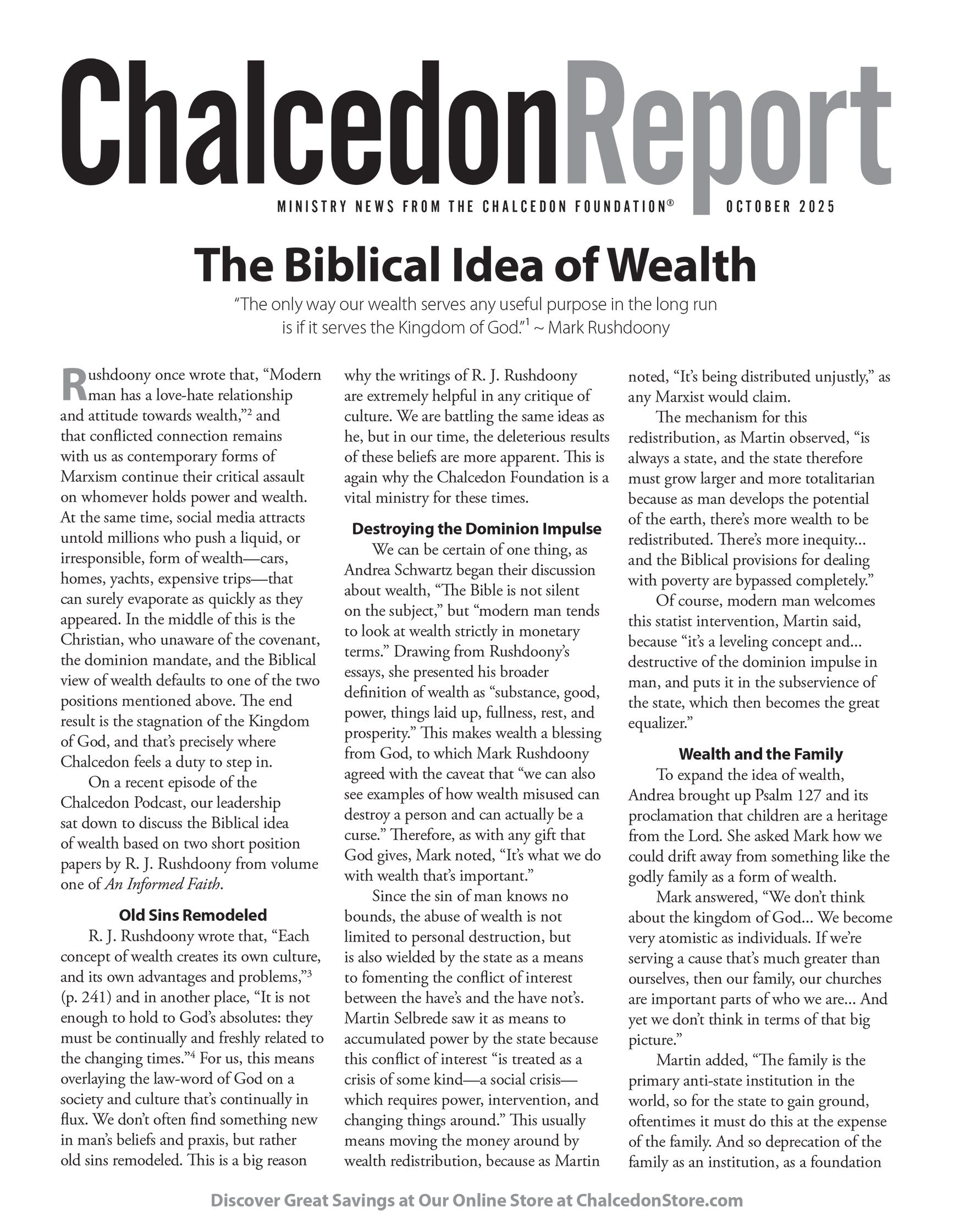 Chalcedon Report is a bi-monthly newsletter featuring ministry news, photos, updates, as well as articles along with a two-page letter from Chalcedon president, Mark Rushdoony. You’ll receive six issues per year delivered on the alternate months you’ll receive Arise & Build.