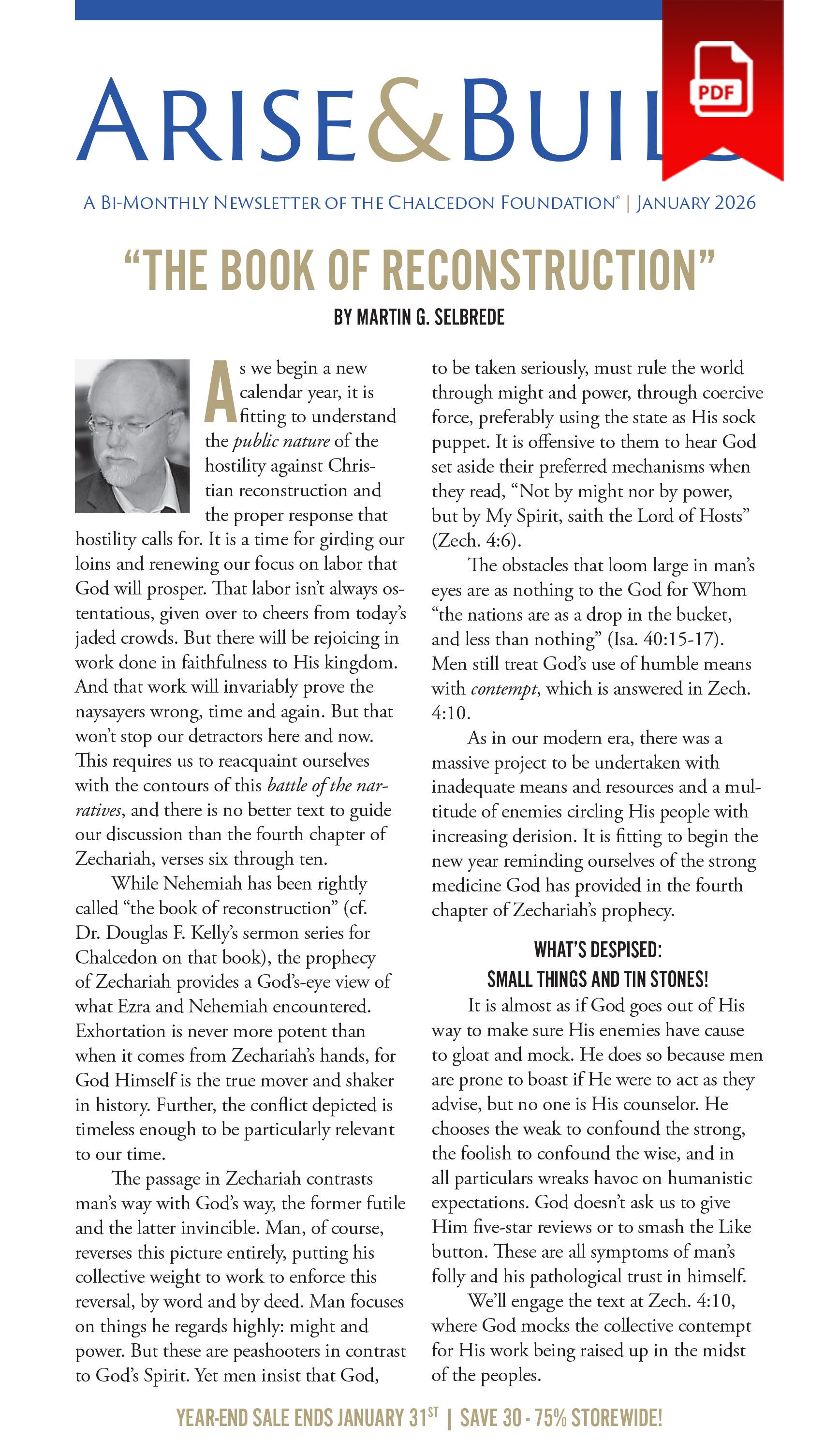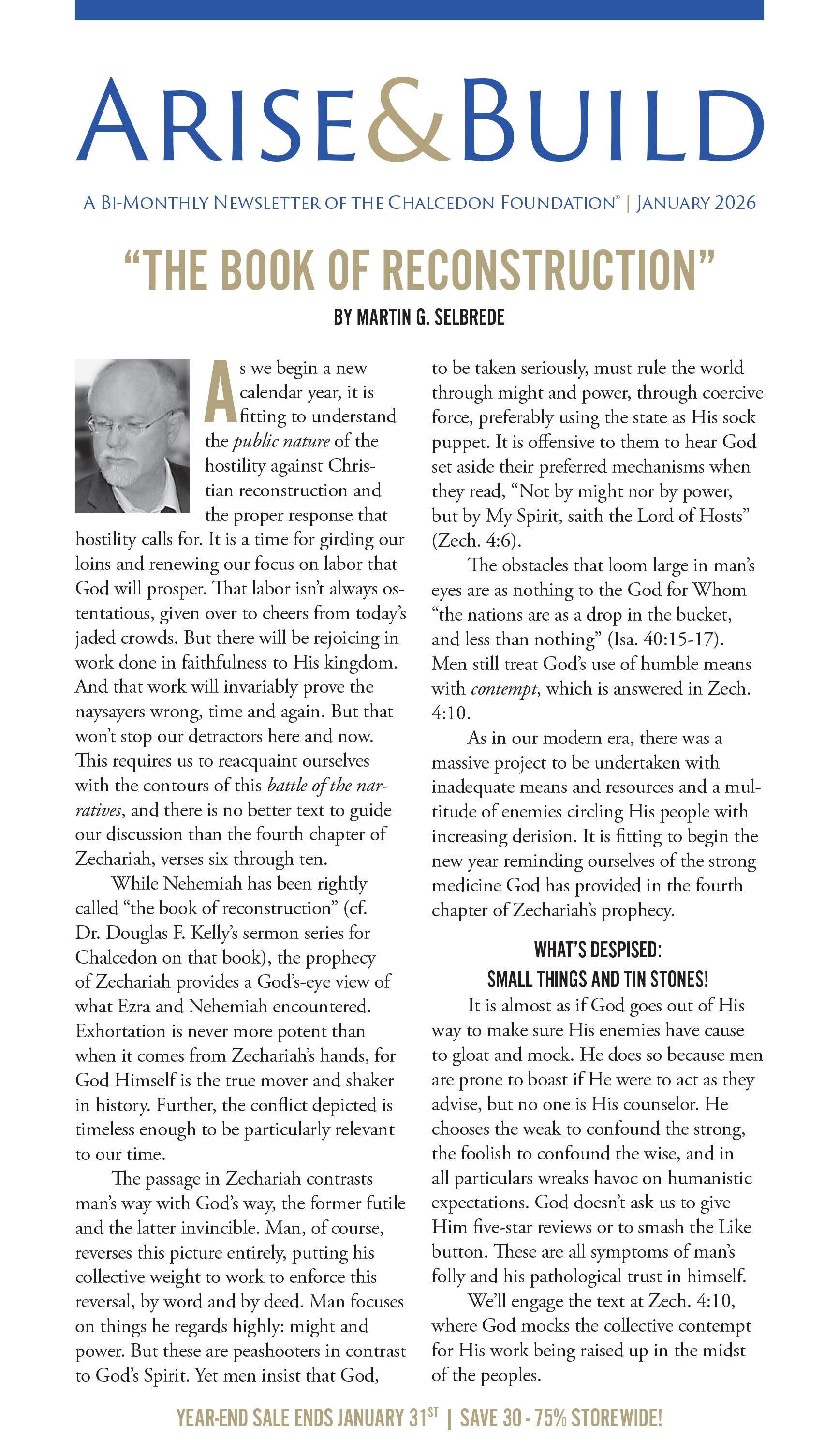 Chalcedon Report is a bi-monthly newsletter featuring ministry news, photos, updates, as well as articles along with a two-page letter from Chalcedon president, Mark Rushdoony. You’ll receive six issues per year delivered on the alternate months you’ll receive Arise & Build.